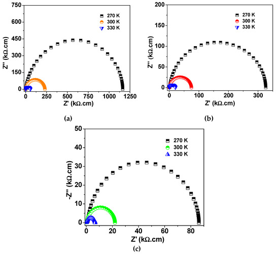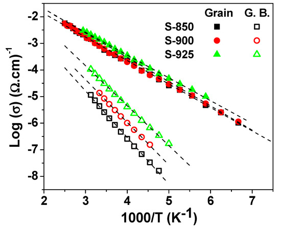Figure 8 depicts the Arrhenius plot for the conductivity of the grain and the grain boundary of the current ceramics. Therefore, the electrical conduction mechanism is via the nearest-neighbor hopping according to the Arrhenius law of resistance, Equation (1):