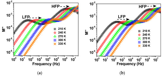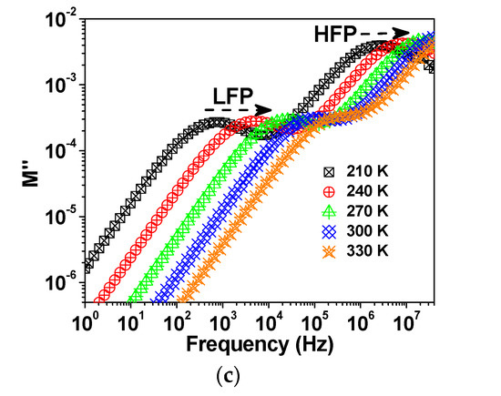 Figure 9 shows the spectra of M″ at selected measuring temperatures for each sample, where M″ is the imaginary part of the electric modulus M″ (M* = M′ + jM″ = 1/ε*, where ε* is the complex dielectric constant. Two relaxation peaks exist in the spectra of M″ at a given temperature. The height of the M″ peak is known to be inversely proportional to the capacitance C (M″/ε0 = 1/2C) [30], where ε0 is the permittivity of free space (ε0 = 8.854 × 10−14 F/cm). Therefore, the low-frequency peak (LFP) and the high-frequency peak (HFP) were attributed to the influence of the grain and the grain boundary, respectively, on conductivity relaxation of the samples. Both LFP and HFP peaks shifted toward high frequency with increasing temperature, which indicates that the relaxation time decreases with increasing temperature.