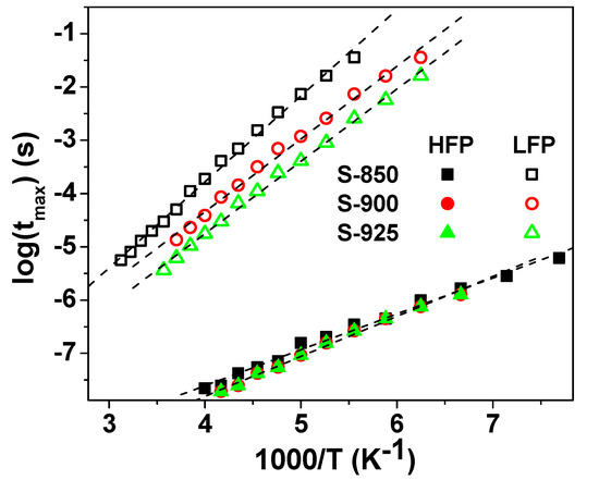 The mean value of the relaxation time, τ, was calculated from the peak frequency (fmax) as τ = 1/2πfmax. As seen in Figure 10, the temperature dependence of τ was found to fit the Arrhenius relation, Equation (2) [13,31]: