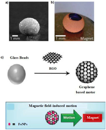 Formation of marble-like liquid microdroplets using (a) Fe2O3 and (b) Fe3O4 nanoparticles after suspension in a liquid. The marble can be opened and exposed to it water content (dark blue circle) when the magnetic nanoparticles are pulled by the magnetic field. (c) Mechanism of preparation and motion of reduced graphene-oxide motor. Reproduced from [14] with permission.