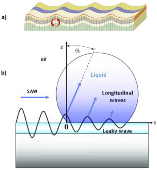 In a different study, the interaction of surface acoustic waves (SAW) with a liquid on the surface of a piezoelectric substrate led to an increase in acoustic radiation pressure in the fluid. This pressure caused an internal stream of SAW-mediated in the fluid and the actuation of small droplets. A snapshot of a SAW-propagating liquid on a solid surface and the origin of such acoustically induced internal streaming is shown in Figure 3 [13].