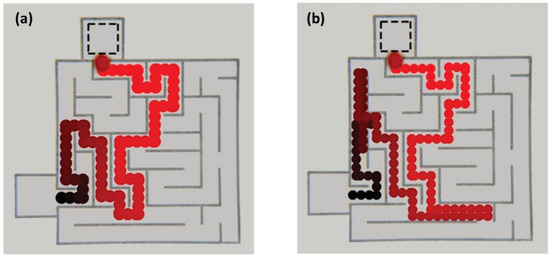 Maze solving by chemotactic droplets (HDA in DCM) in a pH gradient in a maze (the droplets move toward regions of low pH through the shortest possible path). (a) The HDA/DCM droplet solves the maze without any deviation, and (b) the droplet drifts in two locations but eventually corrects itself to find the shortest path leading to the maze’s exit. Reproduced from [20] with permission.