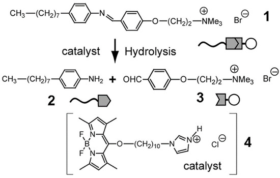 Schematic illustration of the hydrolytic reaction in an oil self-propelled droplet. Chemical fuel (surfactant, 1) produces aniline lipophilic derivative (2) and benzaldehyde hydrophilic derivative (3) in the presence of the catalyst (4). Reproduced from [60] with permission.