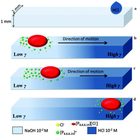 Francis et al. developed another system of chemotactic spontaneous motion based on IL droplets at the aqueous–air interface. They used IL droplets of trihexyl(tetradecyl)phosphonium chloride ([P6,6,6,14][Cl]). The spontaneous motion of these droplets along the aqueous–air interface by chemical gradient is due to the asymmetric release of the cationic surfactant, [P6,6,6,14]+, from the droplet into the aqueous phase. When a surfactant (as a long-chain amphiphile with a hydrophobic tail and hydrophilic head) is released from a hydrophobic microdroplet at the aqueous–air interface of a solution, it interacts with polar molecules present at the solution surface and interrupts their attraction forces. Accordingly, a flow is created in the bulk solution, and the fluid flows from regions with low surface tension to high surface tension, which is considered the Marangoni flow. When a droplet of ([P6,6,6,14][Cl]) floats in an aqueous medium, [P6,6,6,14]+ ions diffuse from the droplet into the solution, interact with the superficial molecules, and decrease the surface tension (Figure 10). At the same time, a proportionate amount of the Cl− ion is lost to maintain the charge neutrality within the droplet. As a result, the release of the surfactant is dependent on the solubility of the Cl− ion. Therefore, the rate of release of the opposite ion, [P6,6,6,14]+, is dependent on the local concentration of Cl− in the aqueous solution. Accordingly, when the IL droplet was immersed in an aqueous solution with a concentration gradient of Cl−, the asymmetric release of the [P6,6,6,14]+ ion resulted in a surface tension gradient around the droplet. Accordingly, Marangoni-like flows were created in the solution and caused the droplets to move from regions with lower surface tension to regions with higher surface tension (higher concentration of Cl− in the solution).