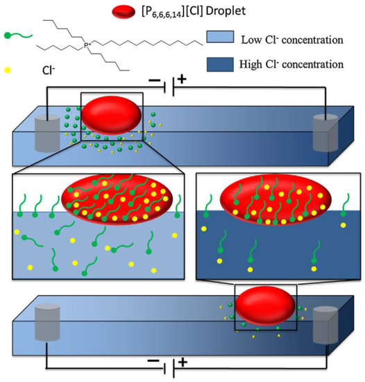 Francis et al. demonstrated that when a single component of IL droplets can respond to an external electrical stimulus, it shows electrotactic motion. They inserted three-dimensional printed (3DP) mesh electrodes into a fluidic channel filled with a NaCl (10−3 M) solution to produce the required ion gradient. Electrotactic actuation of a [P6,6,6,14][Cl] droplet at the liquid–air interface of the solution was achieved by applying an electrical external field through the fluidic channel. This caused the electrolyte ions to migrate to the corresponding counter electrodes and created a concentration gradient of Cl− across the channel. Then, the potential was switched ON, and the [P6,6,6,14][Cl] drop floated on the surface of the solution on the cathode side. The concentration gradient of Cl− led to the asymmetrical release of the cation, [P6,6,6,14]+, and moved the droplet to the anode, as depicted in (Figure 11) [66]. By reversing the polarity of the electrodes, the concentration gradient and motion of the droplet could simply be reversed. A significant advantage of the electrotactic motion of droplets over the chemotactic motion is the ability of concentration gradients to be established and varied dynamically and retained for longer periods of time. These features lead to very flexible control of the direction and speed of the IL droplet’s motion.