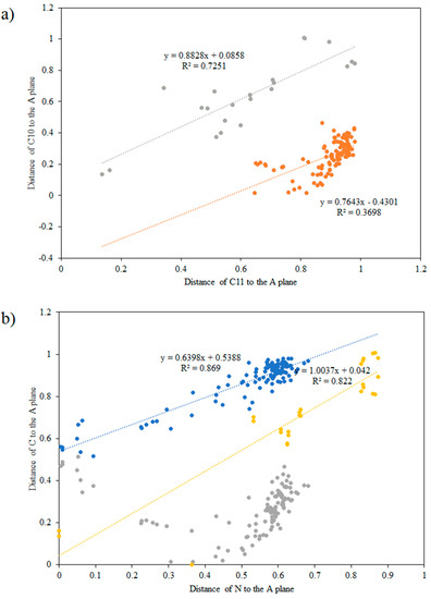 While for 5H-dibenzo[a,d][7]azepine and 5H-dibenzo[a,d][7]annulene the distances of the carbon atoms to the A plane are similar, replacing of the double bond with a single one in 10,11-dihydro-5H-dibenzo[b,f]azepine leads to a difference in both distances. The replacement of the double bond with a single in 10,11-dihydro-5H-dibenzo[b,f]azepine causes that the correlation between the distance of C10 and C11 to the A plane can be detected for compounds with substituents at C10 and C11 atoms, while it is very weak for other compounds (Figure 2a). Differentiation of the C10 and C11 distance to the A plane results in different correlation lines for the distances for the N and C atoms. Additionally, the correlation of the longer C distance splits into correlation for substituted C10(C11) and unsubstituted. Correlation for shorter C distance to the A plane is not a straight line. The correlations in Figure 2 express irregular changes of C10, C11 and C5 distance to the A plane. For 10,11-dihydro-5H-dibenzo[a,d][7]annulene analogous correlations are not seen.