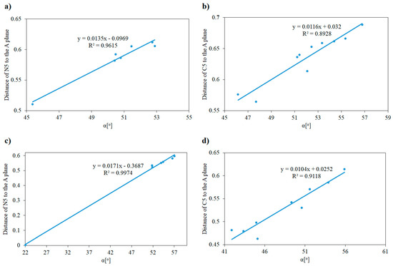 Correlation of the distance of the C5 or N5 atom from the A plane on the α angle on for: 5H-dibenzo[b,f]azepine (a), 5H-dibenzo[a,d][7]annulene (b), 10,11-dihydro-5H-dibenzo[b,f]azepine (c), 10,11-dihydro-5H-dibenzo[a,d][7]annulene (d).
