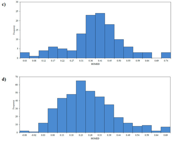 Histogram for the HOMED value for the middle ring of 5H-dibenzo[b,f]azepine (a), 5H-dibenzo[a,d][7]annulene (b) 10,11-dihydro-5H-dibenzo[b,f]azepine (c) and 10,11-dihydro-5H-dibenzo[a,d][7]annulene (d). Compound structures are taken from CSD crystal database.