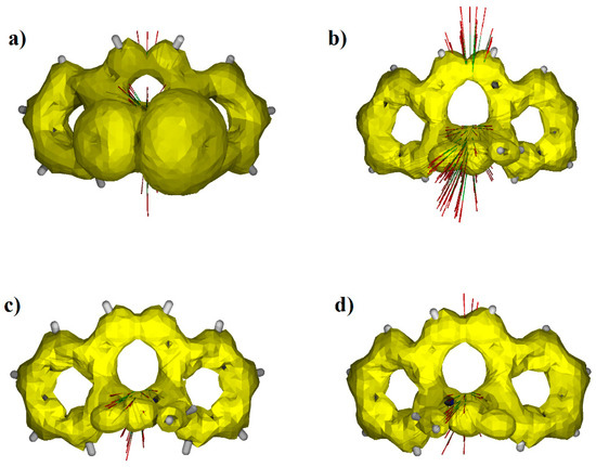 ACID surfaces for selected 5H-dibenzo[b,f]azepine derivatives with different aromaticity of the middle ring. The HOMED value for VUBCAW [67] is 0.7816 (a), for CBMZPN32 [52] −0.0896 (b), for TAZRAO01 [68] 0.6732 (c) and for HEMRIB [63] −0.2506 (d).
