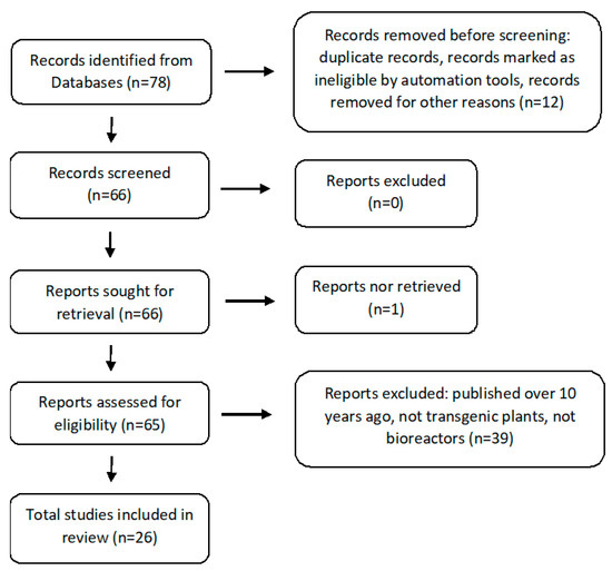 The studies were selected from the electronic databases PubMed/MEDLINE, Scopus, Web of Science, and Google Scholar. The following search terms were used: transgenic plants, secondary metabolites, recombinant proteins, and bioreactors. The search included published experimental studies reporting about various in vitro plant transgenic cultures and focused on the production of various secondary metabolites and recombinant proteins grown in bioreactors on an industrial scale as well as any patents relating to these studies. Papers reporting on articles published in languages other than English, those with only an abstract or lacking full text access, or published over ten years ago were excluded. Each selected document was analyzed and the following data were extracted and presented in a table: scientific species names, plant material used for transformation, vector used f+ or transformation, type of metabolite, type of recombinant protein, bioreactor capacity, and final effect (Figure 1). The main text includes various studies, including examples of transgenic cultures producing increased levels of secondary metabolites and recombinant proteins.