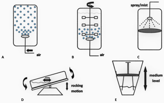 The types of bioreactors most often used for the cultivation of plant cultures in vitro. (A) Bubble column bioreactor, (B) Stirred tank bioreactor, (C) Nutrient mist or sprinkle bioreactor, (D) Wave-mixed bioreactor, (E) Temporary immersion system.