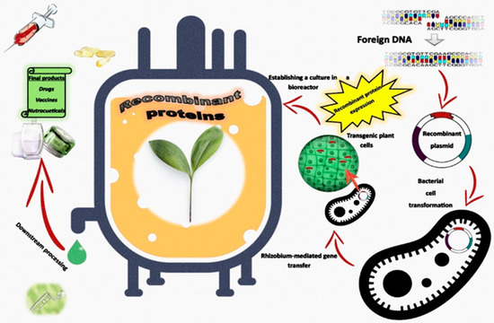 There are essentially three strategies for producing recombinant proteins in plant systems: first, the use of cell culture-based systems that are equivalent to mammalian, microbial, and insect cell models; second, the transient expression of foreign genes in plant tissues, which are transformed by agro-injection or viral infection; and thirdly, the development of transgenic plants carrying stably integrated transgenes. The presented systems enable for high production efficiency through simple manipulation, thus enabling quick validation of the expression constructs and production of large amounts of recombinant protein in a short time [155,156]. The general strategy of obtaining transgenic plants, cells, or tissue cultures expressing recombinant proteins in bioreactors is shown in Figure 4.