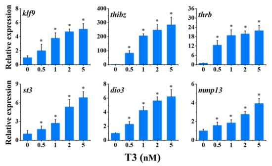 The effects of a series of concentrations of T3 (0.5, 1, 2, and 5 nM) on the expression of six TH-response genes were investigated. As shown in Figure 1, all concentrations of T3, including the lowest concentration, significantly up-regulated the expression of six TH-response genes, kruppel-like factor 9 (klf9), thyroid hormone induced bZip protein (thibz), thyroid hormone receptor beta (thrb), stromelysin-3 (st3), type 3 deiodinase (dio3), and matrix metallopeptidase 13 (mmp13), in a concentration-dependent manner. The changes of klf9, thibz, thrb, st3, dio3, and mmp13 in the highest group of T3 (5 nM) were about 5-, 280-, 21-, 6-, 6-, and 4-fold of the control, respectively. Moreover, among the six TH-response genes, thibz was the most sensitive, with a 200-fold change following 1 nM T3 treatment. Therefore, 1 nM was selected as the induction concentration of T3 in the following tests.