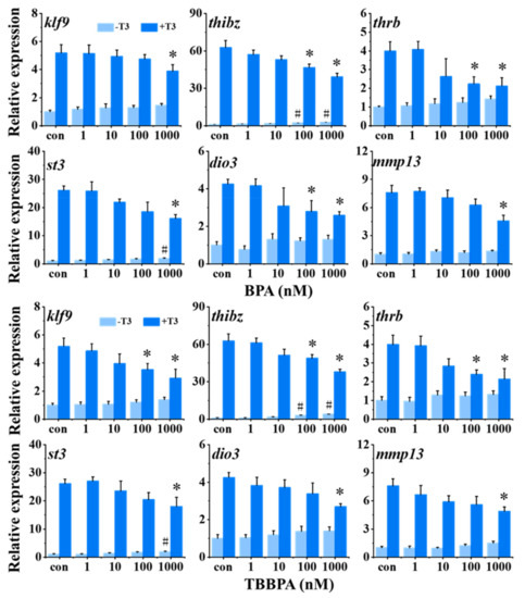 Relative expression of thyroid hormone (TH)-response genes in stage 48 Xenopus tadpoles following 24-h exposure to bisphenol A (BPA) and tetrabromobisphenol A (TBBPA) in the absence or presence of 1 nM T3. Data are shown as mean ± SEM (n = 3). * and # indicate significant differences between BPA or TBBPA exposure and the control and between BPA or TBBPA + T3 and T3 treatment, respectively (p < 0.05). klf9: Kruppel-like factor 9; thibz: thyroid hormone induced bZip protein; thrb: thyroid hormone receptor beta; st3: stromelysin-3; dio3: type 3 deiodinase; mmp13: matrix metallopeptidase 13.