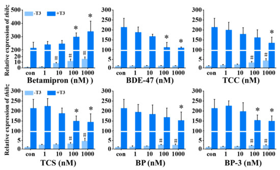 We analyzed the TH signaling disruption activity of betamipron, BDE-47, TCC, TCS, BP, and BP-3 using thibz expression as an endpoint. As shown in Figure 3, 1 nM T3 significantly increased the expression of thibz expression compared with the control. In the absence of T3, 10–1000 nM betamipron significantly promoted the expression of thibz in a concentration-dependent manner, and in the presence of T3, 100–1000 nM betamipron increased the expression of thibz compared with the T3 group. BDE-47 inhibited the T3-induced thibz expression but did not affect thibz expression in the absence of T3. TCC, TCS, BP, and BP-3 had a similar mode of action on thibz expression both in the absence and presence of T3. These four chemicals at high concentrations significantly resulted in down-regulation of T3-induced expression of thibz expression and high concentrations of these four chemicals alone increased thibz expression.