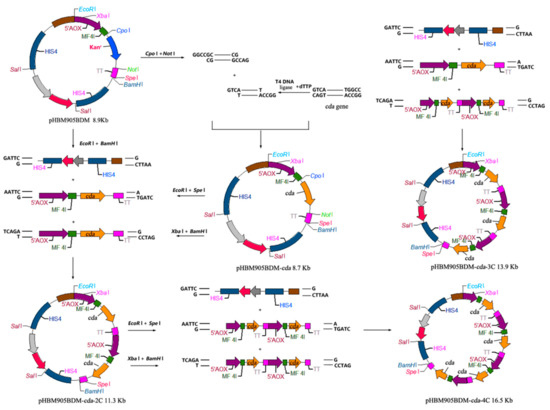 The CDA sequence (GenBank: MW094131) was modified based on P. pastoris codon-usage preference, and synthesized [12] by Sangon BioTech (Shanghai, China). Primers Cdaf/Cdar were synthesized to amplify CDA, which was treated by T4 DNA polymerase for 20 min. The PCR product was ligated into CpoI/NotI-treated restriction sites of the pHBM905BDM plasmid, and transformed into E. coli. The generated pHBM905BDM-CDA plasmid was digested with EcoRI/SpeI or XbaI/BamHI to produce expression cassettes containing the promoter, the leading signal sequence, the target open reading frame and the terminator (Figure 1). pHBM905BDM-CDA1 was further digested with EcoRI and BamHI to produce fragments ligated to the expression cassette, to produce pHBM905BDM-CDA2, containing two CDA copies. The method generated recombinant plasmids bearing three and four CDA copies, respectively. The method to verify the multi-copy plasmid included cutting the expression cassette containing the cda gene with XbaI/BamHI, and then cutting the vector backbone with SpeI/BamHI. After double digestion, the size of the products was calculated, and separated on an agarose gel to determine whether the bands were consistent with the calculated products. After confirming the recombinant vectors, they were labelled pHBM905BDM-CDA2, pHBM905BDM-CDA3, and pHBM905BDM-CDA4 [13,14,15].