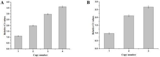 qPCR was performed as described in Section 2.3. We confirmed the CDA copy number in recombinant strains; standard curves for CDA and GAP were generated, showing the correlations between Ct values and copy numbers. The CDA Ct values of strains PCDA1, PCDA2, PCDA3, and PCDA4 were 1.1, 1.99, 2.98, and 3.61 fold higher than GAP, respectively (Figure 3), thus confirming that CDA was present in multiple copies in our strains.