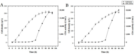Time course of free CDA fermentation. (A) Induction was initiated when OD600 = 150; (B) induction was initiated when OD600 = 200.
