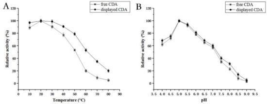 We examined the displayed CDA features. Our data indicated that most features were the same as that of free CDA, however, displayed CDA was more stable (Figure 5 and Figure 6); e.g., the displayed CDA retained 90% of its maximum activity at temperatures 20–40 °C, and pH 4–8. This activity decreased rapidly when the temperature was >50 °C or pH > 8. Displayed CDA thermostability was better than free CDA. It retained 90% initial activity for 300 min at 20–40 °C; but 60% of activity was lost when temperatures >50 °C. When displayed CDA was incubated at 60 °C above for 30 min, its activity was mostly lost. These data revealed that displayed CDA showed improved thermostability, and was stable over wider temperature and pH ranges, than free CDA.