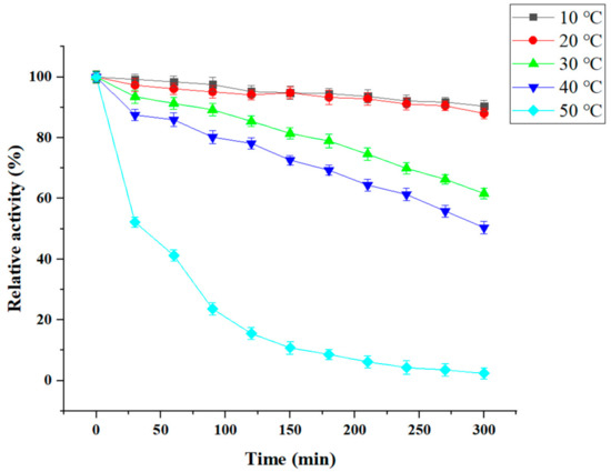 We next studied CDA thermostability at different temperatures, including 10, 20, 30, 40, and 50 °C for different times (Figure 7). Our data showed that 95% of CDA activity was maintained after the enzyme was incubated at 10 °C for 120 min, and almost 91% activity remained after 300 min. At 30 °C, 85% of CDA activity remained after incubation for 150 min. At 50 °C, CDA activity diminished rapidly (e.g., 15% of CDA activity was maintained for 120 min, and was lost after 270 min). This observation demonstrated that P. pastoris CDA exhibited good cold-active properties.