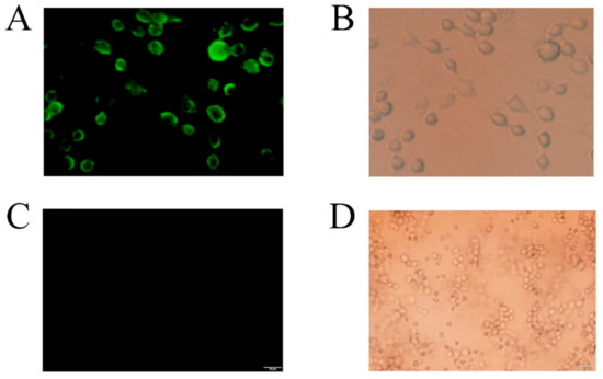 Laser confocal analysis of recombinant cells (displayed CDA) and control cells. Recombinant cells (displayed CDA): (A) the excitation source was turned on. Fluorescent cells indicate that CDA was successfully surface displayed on yeast; (B) the natural light source was turned on. Control cells: (C) the excitation source was turned on, and (D) the natural light source was turned on.