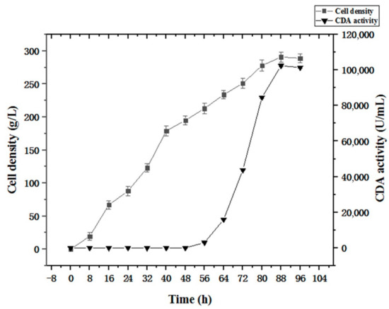 The fermentation strategy (Section 2.5) was applied to recombinant strain PCDA3-AGα1 fermentation (Figure 10). When the cell density reached 200 g/L after glycerol feeding periods, methanol was added to induce CDA-AGα1 expression. The cell density increased to 290 g/L, which was a 4.8-fold increase over shake-flasks. CDA activity reached 102415 U/g dry cell weight after 96 h of fermentation, which was a 1.6-fold increase over shake-flasks. Thus, high cell density fermentation markedly improved cell densities and CDA activity, when compared to shake-flasks. Therefore, combining multi-copy expression strains and high-density fermentation significantly improved displayed CDA productivity.