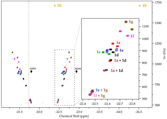Hyperpolarized 2D ZQ spectra [6] of the adenosines’ library. Spectra of all compounds have been recorded separately, referenced to nam signal (using −22.935 ppm for right hand hydride signal [6]) and superimposed. For clarity, all hydride signals for a certain compound are presented in the same color, although the doublet pairs are detected in opposite phase. All analytes (1a–1g) present at least two clearly resolved signal pairs. The dominating signal of complex 2 (dotted line at −21.74 ppm, see Figure S1 Supplementary Materials) was omitted from the spectra by convolution filtering. See Figure S2 for hyperpolarized hydrides’ 1D spectra of all analytes and Table S1 for chemical shifts of hydride signals.