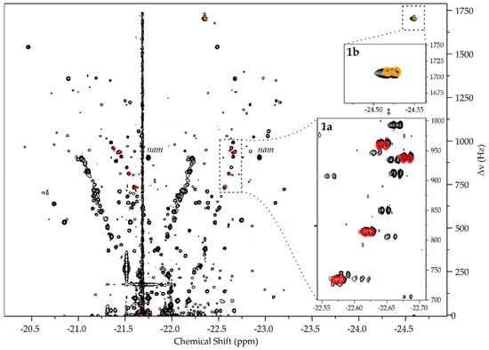 Hyperpolarized 2D ZQ spectrum of urine SPE extract overlayed with spectra of (1a) (red) and (1b) (beige), referenced to nam signal (using −22.935 ppm for right hand hydride signal [6]). All hydride signals of the same analyte are presented in the same color, although the doublet pairs are detected in opposite phase [6].