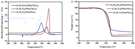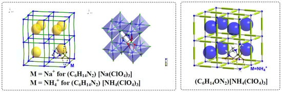 Molecular perovskites have been demonstrated as promising high explosives and solid propellants, which rely on the self-assembly of diverse molecular components into specified ternary crystal structures and exhibit some unique advantages like easy scale-up preparations at a low cost, increased pack efficiency (and crystal density), and optimized oxygen balance [7,8,9,10,11]. Comparative thermal research on the thermal properties and thermal behaviors are crucial to the practical applications of energetic materials [12,13]. Our previous thermal research of (C6H14N2)[NH4(ClO4)3] has indicated a confined effect of the protonated DABCO cation being locked in the cage skeleton constructed by NH4+ and ClO4− ions that renders (C6H14N2)[NH4(ClO4)3] an outstanding thermal stability [14]. More recently, a series of different cations, including the organic cations (the one locked in the cage, A-site cation) and inorganic cations (the one used for the construction of the cage, B-site cation), have also been beautifully introduced for the synthesis of molecular perovskites [11,15]. Obviously, the confined effect from the cage skeleton is distinctive and will be practical in the development of advanced energetic structures, therefore, we are highly interested in how the organic and inorganic cations applied will affect this effect. Herein, we reported a comparative thermal research on two chosen molecular perovskite energetic structures, (C6H14ON2)[NH4(ClO4)3] and (C6H14N2) [Na(ClO4)3], in which different cations were embedded (Figure 1). The thermal behaviors, the non-isothermal decomposition reaction kinetics, as well as the gaseous and solid decomposition products of (C6H14ON2)[NH4(ClO4)3] and (C6H14N2) [Na(ClO4)3] were investigated and compared with those of (C6H14N2)[NH4(ClO4)3] through the combination of differential scanning calorimetry (DSC), simultaneous thermal analysis (STA), solid phase in situ FTIR spectroscopy, and DSC-TG-FTIR-MS technologies [16]. Possible decomposition mechanism was also discussed based on the experiment and calculation results.