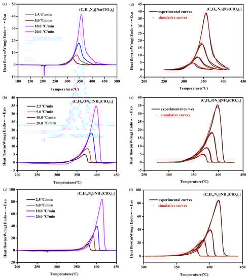 DSC experiments under different heating rates of (C6H14N2)[Na(ClO4)3] (a), (C6H14ON2)[NH4(ClO4)3] (b) and (C6H14N2)[NH4(ClO4)3] (c); The overlay of fitted and measured curves of (C6H14N2)[Na(ClO4)3] (d), (C6H14ON2)[NH4(ClO4)3] (e) and (C6H14N2)[NH4(ClO4)3] (f).