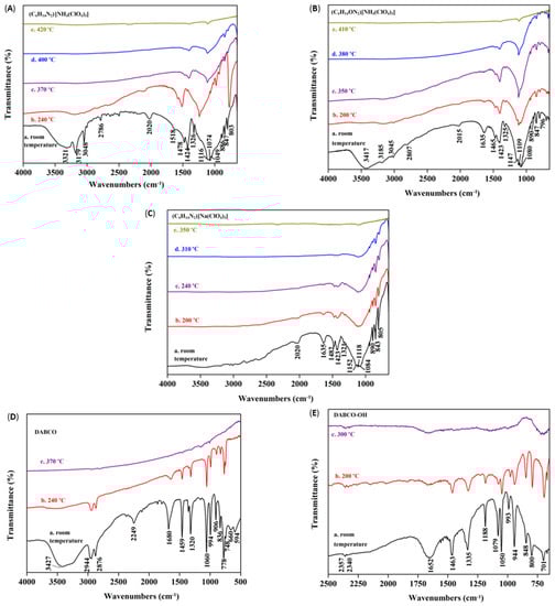 In situ FTIR spectroscopy experiments of (C6H14N2)[NH4(ClO4)3] (A), (C6H14ON2)[NH4(ClO4)3] (B), (C6H14N2)[Na(ClO4)3] (C), DABCO (D) and DABCO-OH (E) at different temperatures.