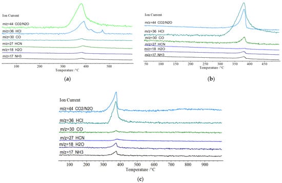Although in-situ FTIR spectroscopy method can provide rich information of the microscopic real-time changes of the condensed-phase during the thermolysis process, it cannot provide the information of microscopic real-time changes of the gaseous-phase products, which is also significant to clarify the thermal decomposition mechanism of energetic materials. For further investigations of the synergistic thermal decomposition mechanisms of the molecular perovskites, DSC-TG-FTIR-MS quadruple technology was further applied to perform the real-time and continuous analysis of their thermal decompositions. The anion (ClO4−) and cations (H-OH-DABCO2+ and H2DABCO2+) contained in the molecular perovskites represent the oxidant component and fuel component, respectively. With the increase in the heating temperatures, the Coulomb forces weakened and the cage skeletons collapsed, which led to the redox process between the ionic components, and the formations of gaseous-phase products [29,30]. Figure 5a–c showed the mass spectra of the gaseous-phase systems of (C6H14N2)[Na(ClO4)3], (C6H14N2)[NH4(ClO4)3], and (C6H14ON2)[NH4(ClO4)3] at a heating rate of 10 °C/min, respectively. The temperatures at which the gaseous decomposition products are detected are basically consistent with the experimental results obtained by DSC-TG and in situ FTIR methods, indicating same order of thermal stability of the three molecular perovskites in other experiments. Meanwhile, the major gaseous products from their decompositions include H2O (m/z = 18), HCN (m/z = 27), NH3 (m/z = 17), CO2 (m/z = 44), CO (m/z = 30), N2O (m/z = 44), HCl (m/z = 36). The similar decomposition products show similar decomposition mechanisms as follows: (1) the organic cations (H-OH-DABCO2+ and H2DABCO2+) was activated before the cage skeletons in which they are located under heating conditions and the hydrogen bonding interactions between the organic cations and ClO4− gradually weaken the stabilities of the cage skeletons constructed by NH4+-ClO4− and Na+-ClO4−; (2) after the interactions between the organic cations and ClO4− are strong enough to destroy the cage skeletons, redox reactions are triggered in which the organic components (including the inorganic cation of NH4+) are oxidized, forming CO, CO2, H2O, HCN, and N2O. In contrast, the ClO4− is reduced to HCl.