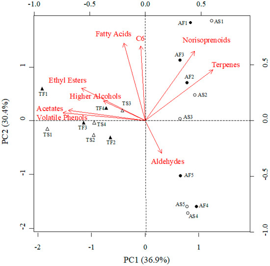 Bi-plot of the first two principal components (PC) for families of volatile compounds related to wine aroma of Albariño (circles) and Treixadura (triangles) wines coming from musts that underwent different clarification treatments: static clarification (open symbols) or flotation (full symbols). The label of each wine is provided close to its symbol (A stands for Albariño, T stands for Treixadura, S stands for Static settling, and F stands for Flotation).