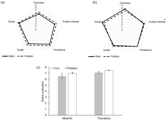 Sensory profile of Albariño (a) and Treixadura (b) wines as a function of the clarification treatment of the musts. Panel (c) displays the global mark given to the wines. The asterisk indicate significant differences (p-Value < 0.05) between treatments for a given descriptor.