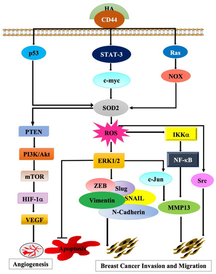 This review presents data from the literature supporting our hypothesis that SOD2 might be a novel transcriptional target of CD44-downstream signaling, which promotes BC cell invasion. We have discussed these lines of evidence and proposed a model of the signaling pathways linking CD44 activation by HA to the transactivation of SOD2 to promote breast tumor cell invasion.