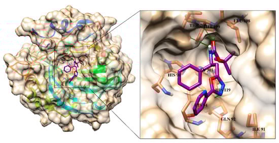 The binding mode of most active compound 4a is shown in the active site of CA-II. The ligand is presented in magenta stick model, 3D-structure of CA-II is shown in surface model, interacting residues are depicted in coral stick model and H-bonds are presented in green lines.