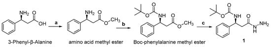 3-Phenyl-β-alanine (10 mmol, 1.65 g) was used as a starting material for the synthesis of Boc-3-phenyl-β-alanine hydrazide (1). Esterification of the carboxylate group was done by the slow addition of thionyl chloride (15 mmol, 2.1 mL) to a solution of methanol (20 mL) containing 3-phenyl-β-alanine at 0 °C. The reaction solution was stirred for overnight (24 h.) at room temperature, while the completion of the reaction was carefully monitored by TLC for ensuring that all amount of amino acid changed to ester. After reaction completion, the solvent (MeOH) was evaporated under vacuum and the resultant product was filtered.