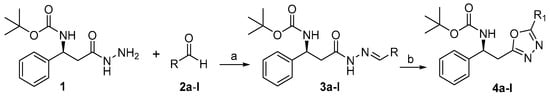 Our investigation started with the cyclization of 3-phenyl-β-alanine hydrazones 3a–l to the corresponding 1,3,4-oxadiazole 4a–l. The synthesis and NMR data of the substrates 3a–l were already reported by our group. These compounds were prepared via the condensation of different benzaldehyde moieties 2a–l (0.6 mmol, 1.2 equiv.) with phenylalanine hydrazide (1, 0.5 mmol, 1 equiv.) in ethanol at refluxing temperature in 90% yield [52] (Scheme 2). The oxidative cyclization of 3a–l to 4a–l was achieved by utilizing molecular iodine in the presence of potassium carbonate (1.8 mmol, 3 equiv.) and DMSO (2 mL) which is the most effective media (solvent) for this conversion at 100 °C. The structures of the resulting compounds were confirmed by 1H-, IR, and 13C-NMR spectroscopy as well as mass spectrometry (HRESIMS).