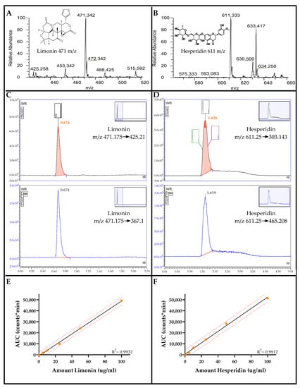 Standard curves were generated from standard solution of single compound (limonin or hesperidin) at the concentrations of 5, 10, 25, 50, 100 µg/ mL in ethanol. The areas under the curve (AUC) of MS chromatograms for the quantified product mass and the corresponding concentrations of limonin and hesperidin were used to create linear standard curves.