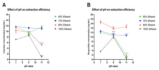 Figure 2. Effect of pH on extraction efficiency. Limonin (A) and hesperidin (B) concentrations in the ethanolic-aqueous extracts of lime peel after extraction with 60% (), 70% (), 80% (), and 100% (▼) ethanol in water with the specified pH values at 50 °C for 100 min. The statistical differences were separately analyzed for limonin and hesperidin by using one-way ANOVA followed by Tukey’s multiple comparisons test. * , **, *** and **** mean p < 0.05, <0.01, <0.001 and <0.0001, respectively, compared with the concentrations of limonin or hesperidin at pH 7 of each specified condition.