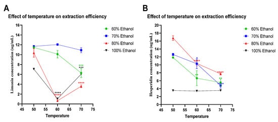 Figure 3. Effect of temperature on extraction efficiency. Limonin (A) and hesperidin (B) concentrations in the ethanolic-aqueous extracts of lime peel after extraction with 60% (), 70% (), 80% (), and 100% (▼) ethanol in water with the specified temperatures, at pH 7 for 100 min. The statistical differences were separately analyzed for limonin and hesperidin by using one-way ANOVA followed by Tukey’s multiple comparisons test. * , **, *** and **** mean p < 0.05, <0.01, <0.001 and <0.0001, respectively, compared with the concentrations of limonin or hesperidin at 50 °C of each specified condition.