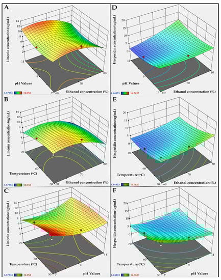 The results of this study showed that ethanol concentration, pH value of solvent, and extraction temperature were key factors affecting the yields of limonin and hesperidin. When analyzed with ANOVA, the interactions between these factors were found. Therefore, response surface methodology (RSM) was used to demonstrate the relationship between these factors and was used to identify the most influential factor. Figure 4A–C and Figure 4D–F show the RSM models for limonin and hesperidin concentration, respectively. The optimum values of the factors are shown within the warm tone color (maximum within red) regions. The response surface analysis (RSA) using ANOVA showed that the extraction yield of limonin depended most on ethanol concentration, followed by extraction temperature. The extraction yield of hesperidin depended most on extraction temperature followed by ethanol concentration. The pH value had the least effect on the extraction yields of both limonin and hesperidin.
