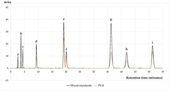 HPLC chromatograms of mixed standard and PLH. The peaks reveal (a) gallic acid, (b) caffeic acid, (c) rutin, (d) rosmarinic acid, (e) luteolin, (f) quercetin, (g) apigenin, (h) kaempferol, and (i) baicalein. The mobile phase consisted of 30% acetonitrile in 0.1% acetic acid and de-ionized water at a flow rate of 1.0 mL/min. The content peaks were detected by a UV detector at 325 nm.