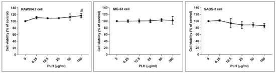 Viability of RAW264.7, MG-63, and SAOS-2 cells incubated with various concentrations of PLH using MTT assay. Each value is the mean ± SD of three independent experiments. # p < 0.05 vs. control (0).