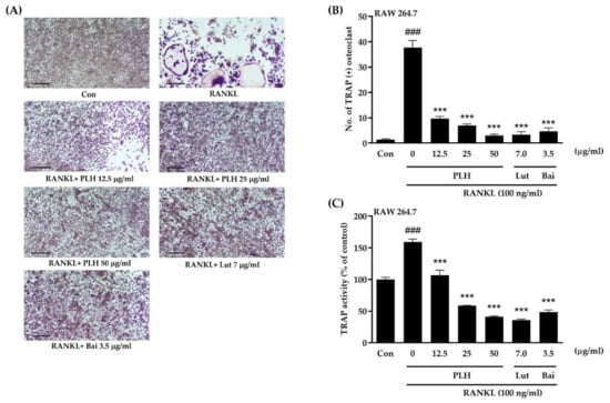 In contrast, when the cells were treated with PLH, the number of multinucleated cells was remarkably suppressed in a dose-dependent manner. Luteolin at 7 µg/mL and baicalein at 3.5 µg/mL, calculated to be equivalent to 50 μg/mL of PLH, similarly suppressed RANKL-induced osteoclast differentiation. TRAP activity was also quantitatively examined: It was found that the activity was increased up to 159.15 ± 7.9% after treatment with RANKL compared to the control. PLH significantly inhibited RANKL-induced TRAP activity in a dose-dependent manner, similar to luteolin and baicalein treatment (p < 0.001) (Figure 4C). These results indicate that luteolin and baicalein-enriched PLH can exhibit a potent inhibitory effect on RANKL-induced osteoclast formation.