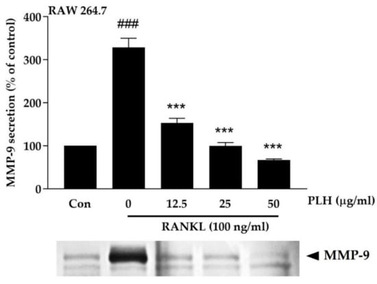 RANKL-induced MMP-9 expression by PLH treatment. RAW264.7 cells were co-treated with RANKL and PLH for 72 h. Culture supernatants were collected, and the secretion of MMP-9 was analyzed using gelatin zymography. Each value is the mean ± SD of three independent experiments. ### p < 0.001 vs. control (Con), *** p < 0.001 vs. RANKL treatment (0).