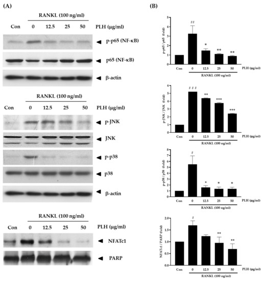 RAW264.7 cells (1 × 106 cells/well) were cultured in a 12-well plate, pretreated with various concentrations of PLH (0–50 µg/mL) for 12 h, and stimulated with RANKL (100 ng/mL) for 10 min. Whole cell extracts were prepared with RIPA lysis buffer. Nuclear fractions were prepared using the nuclear extraction buffer. Protein concentration was determined using the Bradford Protein Assay Kit (Bio Basic Inc., Markham, ON, Canada). Equal amounts of protein were subjected to sodium dodecyl sulfate polyacrylamide gel electrophoresis (SDS-PAGE), followed by transfer to nitrocellulose membranes. After blocking with 5% BSA, the bands were probed with specific primary antibodies and incubated at 4 °C overnight. HRP-conjugated secondary antibodies were then added. After incubation, the targeted proteins were visualized by enhanced chemiluminescence (ECL) reagents (Bio-Rad, Hercules, CA, USA). Images were exposed to the X-ray film (GE Healthcare Ltd., Chicago, IL, USA). PARP and β-actin were used as the internal reference.