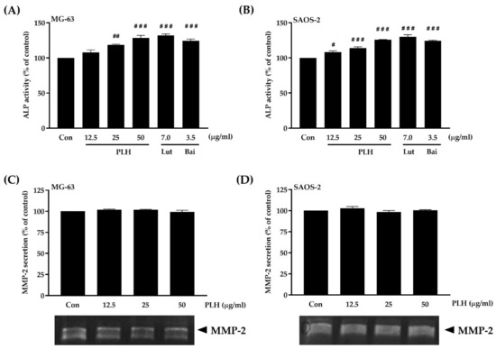 Besides osteoclastogenesis, we also studied osteoblast function using MG-63 and SAOS-2 cells [59,60,61,62,63] by measuring the activities of ALP and MMP-2 as important markers for the early and late differentiation of osteoblast cells, respectively [64]. ALP can hydrolyze inorganic pyrophosphate, which is a naturally occurring inhibitor of mineralization [65], whereas MMP-2 can shed the immune costimulatory molecule B7-H3 from the cell membrane of osteoblasts, leading to bone mineralization [66]. Figure 7A,B shows the increase in ALP activity in both MG-63 and SAOS-2 osteoblast cells after PLH treatment for 72 h, consistent with luteolin and baicalein treatment, which are the main compounds in PLH. In contrast, Figure 7C,D shows that PLH did not affect MMP-2 levels in either MG-63 or SAOS-2 cells compared to the control. Based on these results, PLH is able to induce the differentiation of early-stage osteoblasts through ALP activation and is not associated with MMP-2.