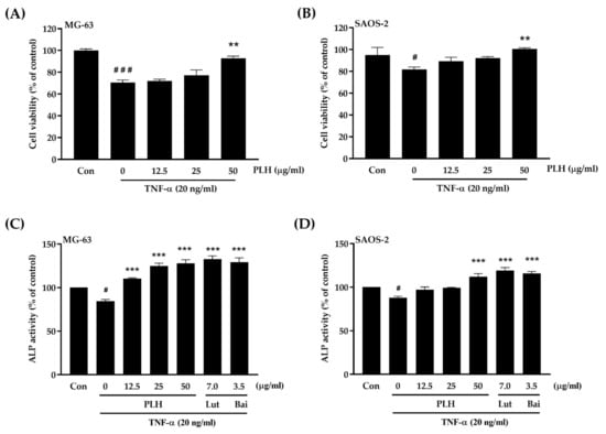 PLH restored TNF-α-suppressed osteogenic potential. Cells were co-treated with TNF-α (20 ng/mL) and various concentrations of PLH (0–50 μg/mL) for 48 h (cell proliferation) and 72 h (ALP activity). (A) MG-63- and (B) SAOS-2-treated cells were measured for viability using MTT assay. (C) MG-63- and (D) SAOS-2-treated cells were tested for ALP using colorimetric analysis. Each value is the mean ± SD of three independent experiments. ### p < 0.001; # p < 0.05 vs. control (Con), *** p < 0.001; ** p < 0.01 vs. TNF-α treatment (0).