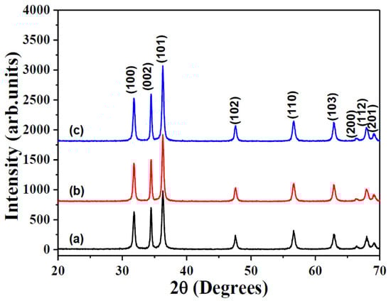 The powder XRD patterns of pure ZnO sample-S0 (a), sample-S0.2 (b), and sample-S0.8 (c) photocatalysts.